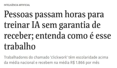 Trabalhadores executam tarefas cruciais para o desenvolvimento de sistemas de IA, como classificação de dados e moderação de conteúdo. Mas são invisíveis e mal remunerados. Em plataformas como Appen, Tellus e Oneforma, eles recebem baixos salários e trabalham em condições precárias sem benefícios, com contratos frágeis. Também são desprotegidos legalmente, com pouca chance de reivindicar direitos trabalhistas devido à falta de representação legal das empresas em países como o Brasil. Reportagem em colaboração com Matheus Viana Braz.